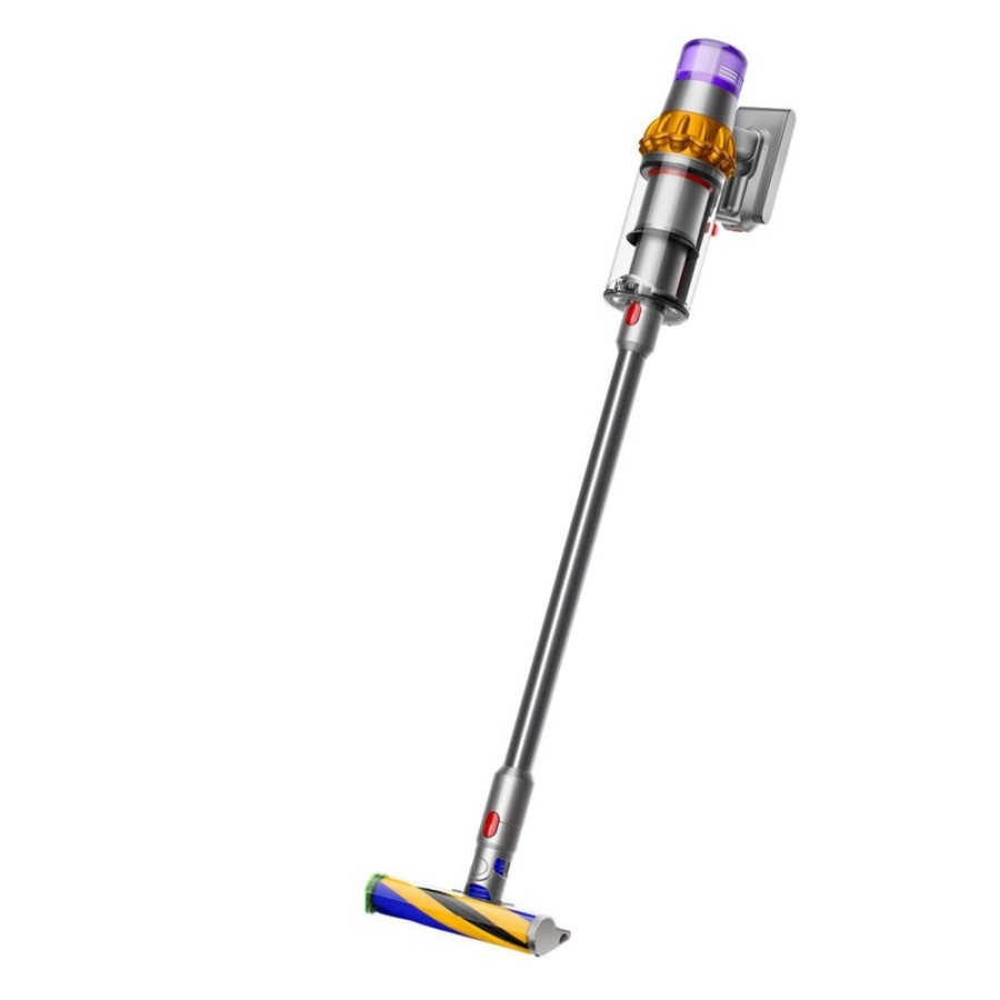 Dyson V15 Detect Absolute SV47 — флагманская модель 2023 года в стильном жёлто-никелевом оформлении.
